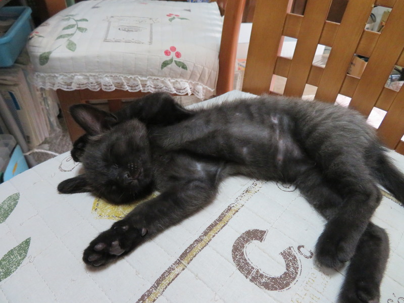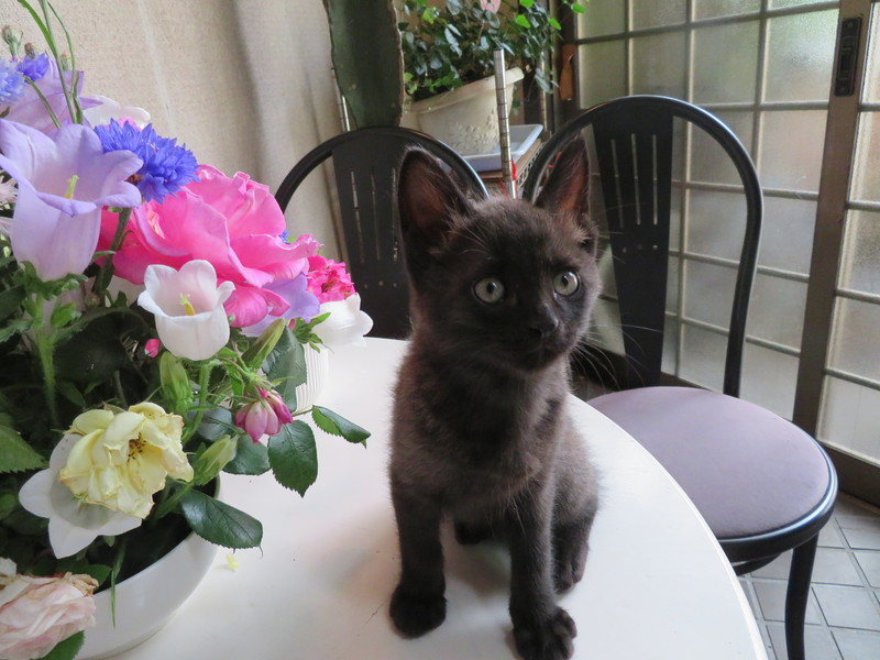 | 特徴(性格など) | 元気に家中を走り回る活発な男の子。体はグレーで耳手足尻尾がクロです。人間によく慣れており、抱き上げるとゴロゴロいいながらそのまま寝たりします。抱かれるのが好きでじゃれついてきます。肩の上にのって顔をペロペロなめてきます。気が優しいところがあり、同時期に保護された兄弟にゴハンをとられてもおとなしくしています。大きな猫にも遊んでもらおうとして、ちゅうちょなく飛びかかっていきます。 | ||