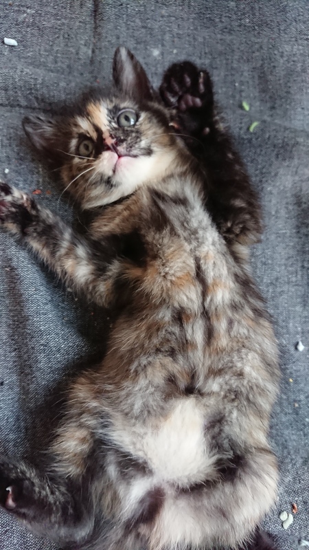 | 特徴(性格など) | 綺麗なべっ甲柄で鼻筋にオレンジが入っています。目はキトンブルー、しっぽは真っ直ぐで長いです。 よく食べよく遊び、糞も健康的です。人慣れはしており撫でるとゴロゴロ言います。驚いた時や顔の前に手を突然出すとシャーとは言うものの、噛み付くことはございません。 |