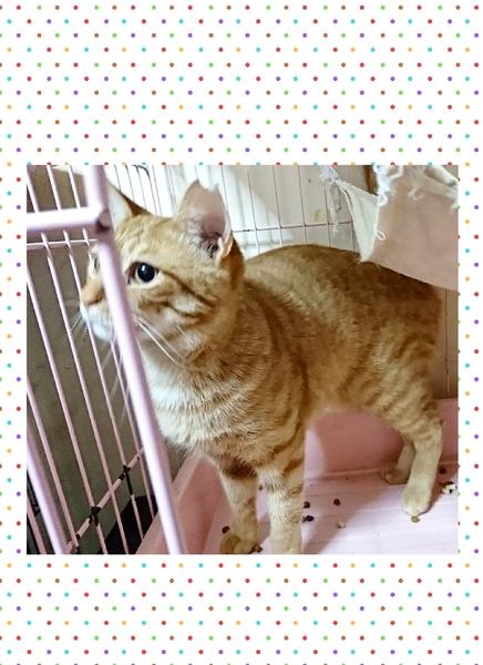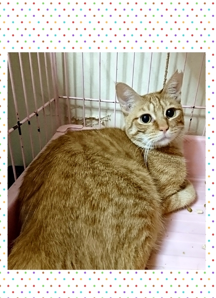 | 特徴(性格など) | 茶トラの女の子。約1歳。 ひとなつっこい子で、初対面の人に対してもケージの中から鳴いてアピールする、とっても可愛い女の子です♪ |