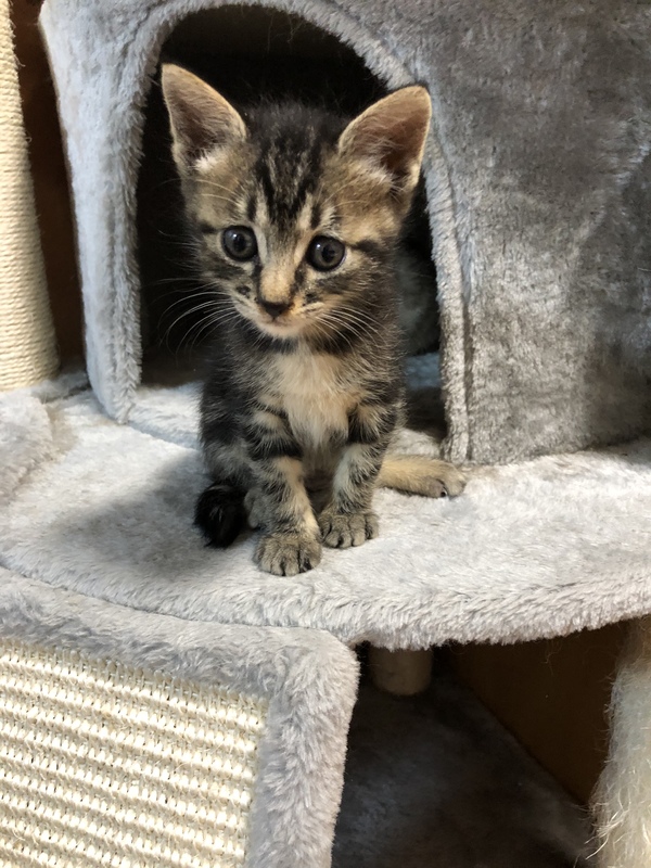 | 特徴(性格など) | 全体的に黒っぽいですがよく見ると少しタビーが混ざってるようです。尻尾は先の方だけピカチュウのように少し曲がっています。賢い子でトイレも1番にできるようになりました。おもちゃでもよく遊びごはんも食べれますがまだミルクが恋しいようで哺乳瓶で飲んでいます。物心ついた時から人間に育てられたので人慣れ抜群。先住猫とも一緒にしていたので猫も大丈夫です。 | ||