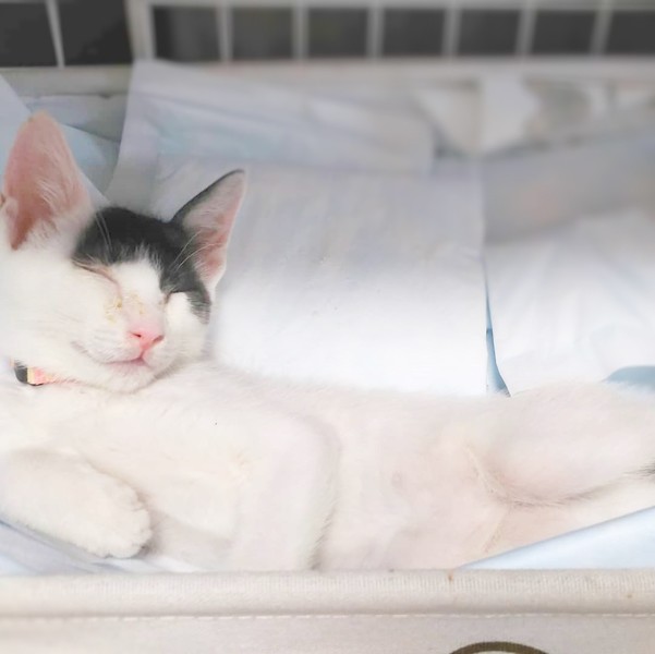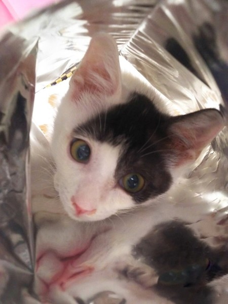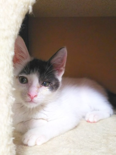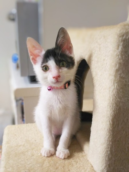 | 特徴(性格など) | 用水路にはまったり、捕まる時に怖い思いをしたのか少し怖がりさんで初めはシャーシャー言いましたが、今ではすっかり甘えたさんになり肩とかにも登ってきて甘えるそうです。 少し風邪症状はありますが病院で注射をしてもらって、預かりボランティアさんのお宅で過ごしています。 |