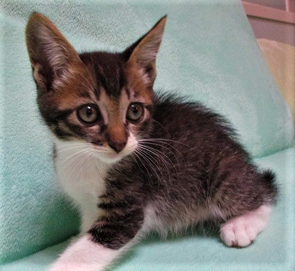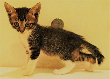 | 特徴(性格など) | 尻尾が長くて、耳が大きくて、茶色が入った男の子なのに、 三毛のようなキジトラ白くんです。 少しシャイですが、段々と懐っこくなると思います。 他の猫たちとも仲良くしています。 よく食べて健康状態は良好です。 健康チェック(ノミ、ダニ、お腹の駆虫、 耳ダニ)などは済みです。 トイレのしつけも済んでいます。 |