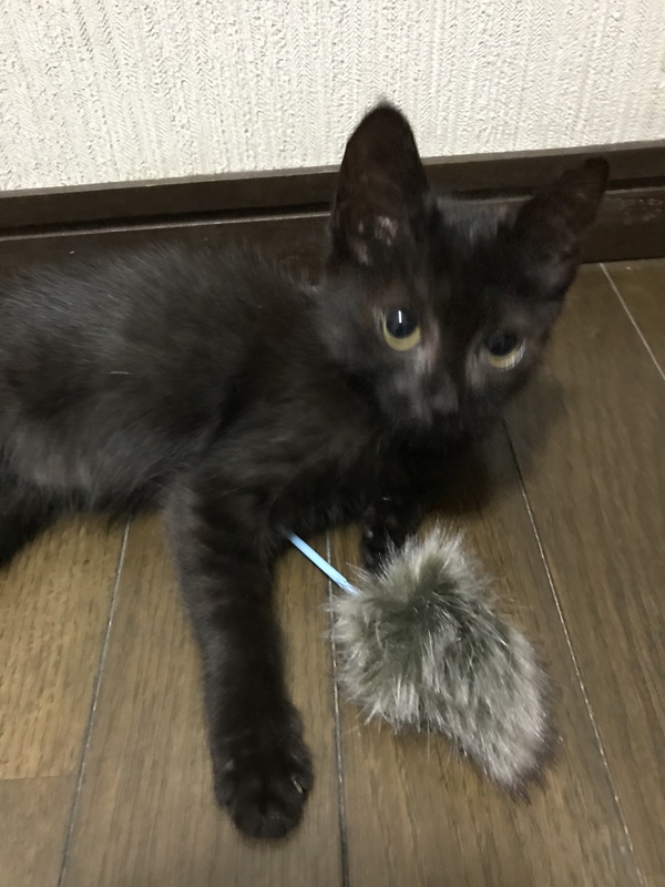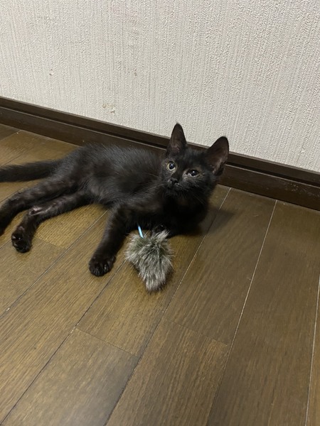 | 特徴(性格など) | 黒色女の子 元気いっぱいのやんちゃな子です おもちゃで遊ぶのが好きです ワクチンは1回目が終わっています(7/28現在) 猫エイズ・白血病共に陰性でした |