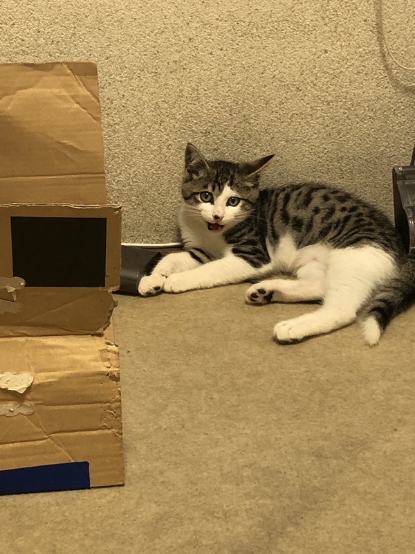 | 特徴(性格など) | よくお喋りします。保護前から人に対して興味を持っている子で、シャーッと威嚇はするものの、噛みつこうとしたり、引っ掻こうとしたりはしません。人を怖がり姿を見ると狭いところに隠れてしまいますが、その後恐る恐る出てきて遊びたがります。撫でられるのが好きで顎の下を撫でるとゴロゴロ言う甘えん坊です。 | ||