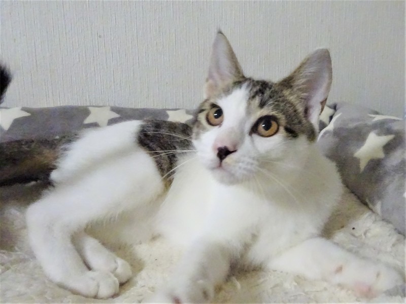 | 特徴(性格など) | 仮名:よのすけ君(オス) 毛色:白キジ、尻尾長い 性格:初めて会ったときから威嚇なく、攻撃性なく抱っこ出来る子です。猫飼い初心者のかたでも大丈夫と思います。 同月齢の他猫と、トラブルなく付き合えるようです。今は、遊び第一で、走り回り、プロレスしたりしています。 性格の良い子です。 飼い主さんの安心のためにケージをお使いになる事をお勧めしています。 ノミ取り済 検便済 駆虫済 3種混合ワクチン済 去勢手術済 猫エイズ・白血病ウィルス検査はともに陰性です |
