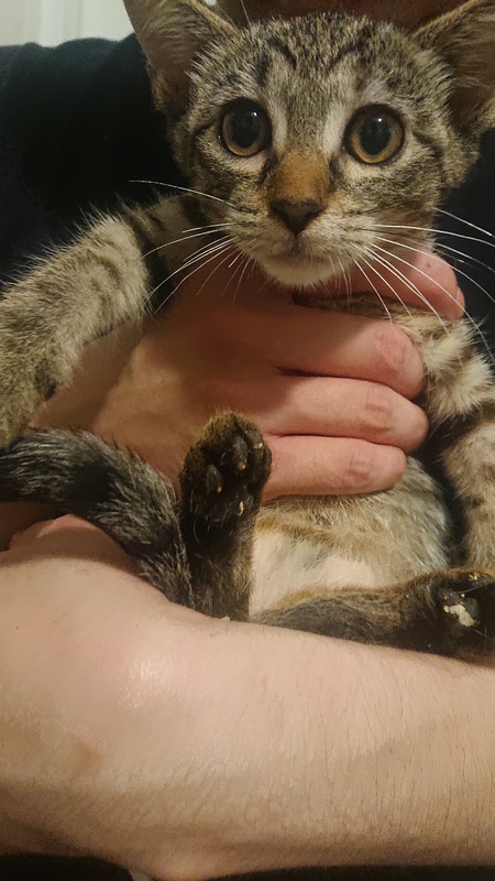 | 特徴(性格など) | 黒いサバ模様の女の子で、性格は少し強気で警戒心が強いです。 ただ、人には慣れていて撫でなり抱っこしたりする時は大人しく、大変かわいい顔をしています。 |