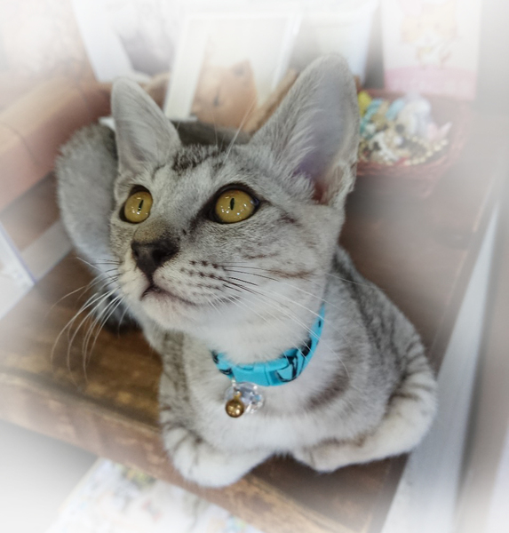| 特徴(性格など) | 涼し気なシルバーグレーの体、お腹は白にグレーの点々、手足と鍵尻尾の先とオデコが縞々です。 活発で甘えん坊。違うページで掲載のマリモちゃん(メス)と仲良く育っています。人も大好きで慣れ慣れ、ぺったりくっついて来るカマチョボーイです♪ |