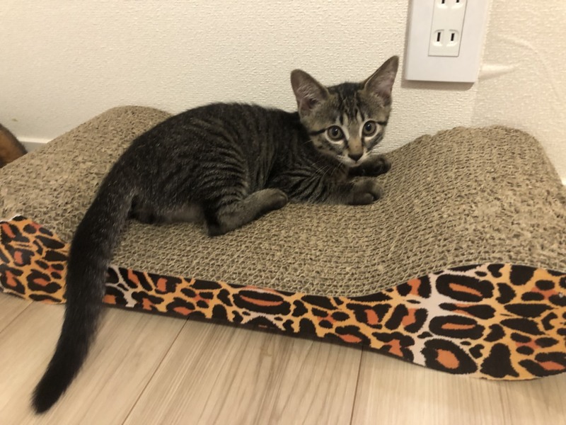 | 特徴(性格など) | 2020.5.10生まれ(推定) 毛色:キジトラ 黒キジトラのぱっちりお目目がかわいい女の子。 ご飯より遊びが大好きな子です。 時折小首を傾げてこちらを見ているなんとも可愛らしいカイラ。 ゆっくりスピードモードならお掃除ロボットとも遊べます( ̄▽ ̄) おしとやか系女子ですが、ニャンプロは男子にも挑む元気女子! 兄妹と一緒のお家だと嬉しいです(^^) |