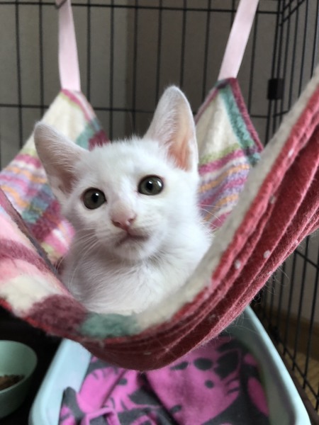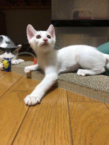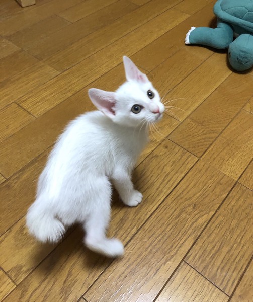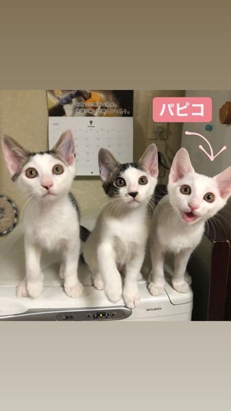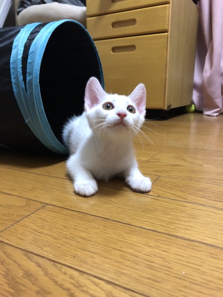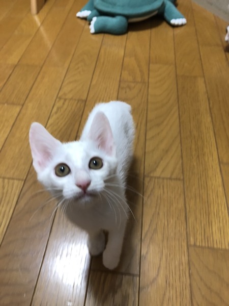 | 特徴(性格など) | 2020.6.5生まれ(推定) 毛色:白 兄妹の中でも1番小柄な白猫の女の子。 運動神経がバツグンに良く、兄妹達を毎日ハァーハァー言わせています(笑) 人の足元をチョンとして走り去るのは、追いかけっこのお誘いのようだけど、 怪我するといけないので(人間が)お断りしています。 疲れ知らずの元気っ子パピコと、たくさん遊んであげてください。 兄妹一緒のお迎えも可能です。ご相談くださいませ。 |