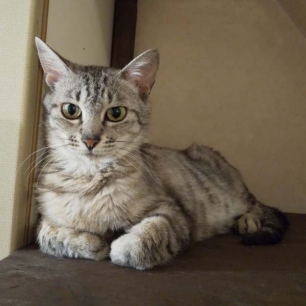 | 特徴(性格など) | 仮名:ユキ 毛色:サバトラ 瞳の色:薄い黄緑色 尻尾:長くて真っ直ぐ 性格・特徴:短毛ですが、長毛種のような柔らかい毛質。 保護時は軽くカールがかかっているように見えましたが、食生活が改善したせいか真っ直ぐな毛になってきました。 大きなお目目に大きなお耳の美人さんです。 保護時は威嚇は出るものの、ひっかきや噛みつきは一切ありませんでした。 だんだん威嚇もなくなり、なでさせてくれるようになりました。 おでこにチューもでき、座った状態ならギュッと抱きしめることもできますが、抱っこされることは嫌がります。 外で暮らしていたとは思えないほど、とても穏やかで、決して人に媚びることなく凛とした貴婦人の風格がある子です。 これまで妊娠、出産を繰り返して、子育てで精一杯だったと推測されます。 避妊手術を終え、やっとゆっくりと家猫としての生活を楽しむことができるようになりました。 どうぞ安心、安全な暮らしを提供してあげてください。 多頭飼いでカリカリが出しっぱなしのため、外での生活の反動で食べ過ぎる傾向にあり、若干太り気味になってしまいましたが、里親さんのお家に行って1日2回の食生活になれば自然にちょうどいい体型に戻ると思います。 ほかの猫とケンカすることもなく、仲良く生活できているので、複数飼いをおすすめします。 同時に募集している多頭崩壊レスキューの子たちとも相性がいいので、2匹でお迎えいただけるとありがたいです。 システムトイレのしつけ済み。 |