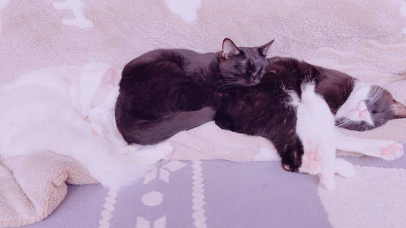 | 特徴(性格など) | 黒猫…4歳 メス 特に男性に人見知りしますが、懐くとベッタリです。お腹の上に乗ってきて、よくフミフミ、ゴロゴロします。筋骨隆々ですがとても優しく面倒見の良い女の子です。尻尾で挨拶するのが得意です。 白猫… 3歳 オス 全く人見知りせず、どんな人にもすぐ懐きます。マイペースで、いつもお腹を見せて寝ています。少し短足でポテポテとのんびり歩く姿が可愛いです。ふわっふわの毛をしていて、たんぽぽの綿毛みたいです。 ハチワレ… 2歳 オス まだ少し体が小さいです。1番活発で足がとても早くジャンプ力あります。細身の体です。そしてとっても甘えん坊です。どこに行くにも後ろをいつも着いてきて、姿が見えないと細い声で鳴いて飼い主を探します。姿が見えると一目散に走って体を擦り寄せてきます。 |
