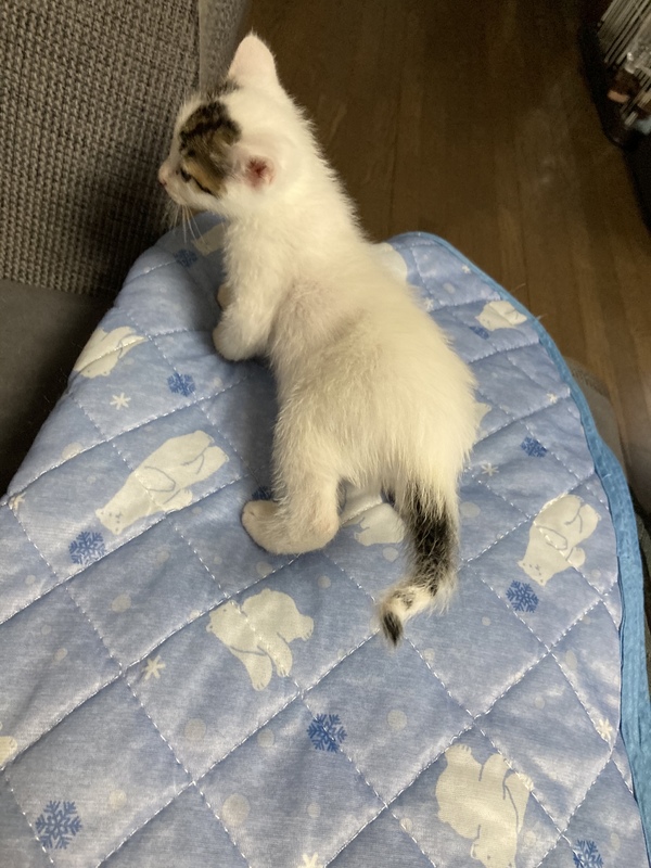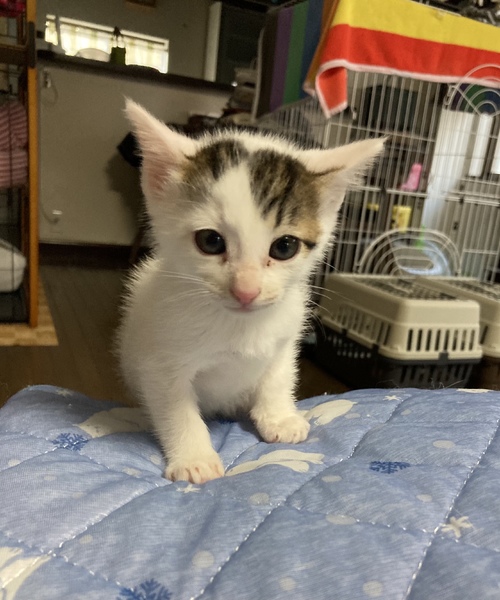 | 特徴(性格など) | 真っ白で、頭と尻尾に柄があります。 小柄でとても可愛らしいです! 活発で、食いしん坊な元気いっぱいの男の子です。 |