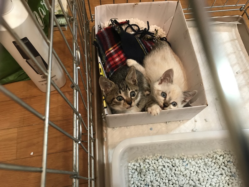 | 特徴(性格など) | シャム系は女子、キジ系は男子です。 女の子はやはり少し用心深いですが男の子はおおらかな感じです。いつも2人で遊んでいます。 |