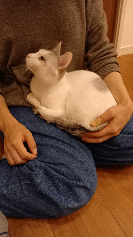 | 特徴(性格など) | 少し人見知りでビビり。初めのうちはシャーすると思いますが必ず慣れます。話しかけると必ず返事をしてくれて、お膝が大好きな甘えん坊さん。猫じゃらしや鈴のボールで遊ぶのが大好きです。サバシロ、尻尾はまっすぐ長いです。 |
