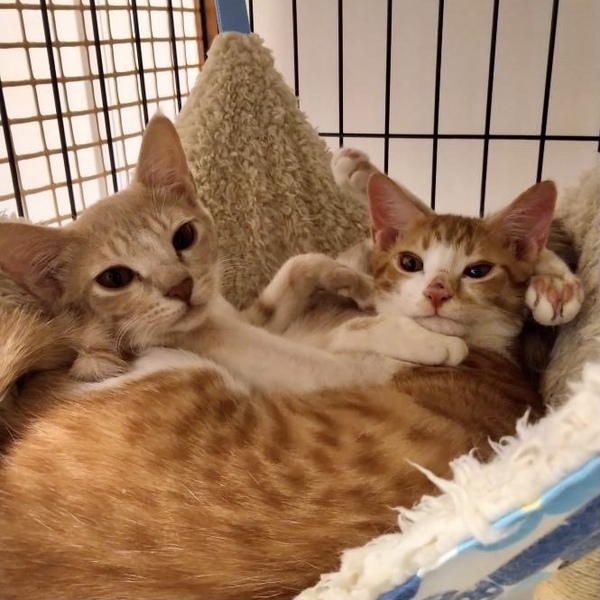 | 特徴(性格など) | ベージュ白(薄茶白)メス★フウちゃん 茶白オス★ヨウくん ※ペアでの譲渡になります 途中、風邪の治療で抗生剤を飲ませたところ、生体バリア機能が乱れて、真菌にかかり、お鼻の先が黒ずんだり、足などにおハゲができました。やっと新しい毛も生えてきて回復しました。 そういう諸々を乗り越える過程で人との信頼関係もしっかりと築くことができたと思います。 子猫たちは元気いっぱいです。 預かり宅では先住猫さんもいますので大きめのケージで過ごしつつ、時々キッズテントなどで解放して遊んで貰っています。 初心者の飼い主さんでも飼いやすいように肉球を触って爪切りなど毎日スキンシップをしてもらっています。 最初はやはりケージ生活で、引き続きゆっくり付き合ってくだされば皆それぞれ甘えん坊になると思います。 先住猫さんとも、ペアで迎えてくだされば程よい距離感で仲良くなれると思います。(まだ人より猫に興味があります。) 健康状態 保護当初、目の腫れなどありましたが今はしっかり抗生剤を飲ませて完治しました。 母猫のウイルス検査(エイズ・白血病)陰性 →他の猫との接触がないので子猫も陰性です ワクチン 駆虫 検便 シャンプー 爪切り ※2回目ワクチンや避妊去勢手術後のお届けも可能です。その際は実費をご負担ください。 |