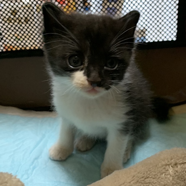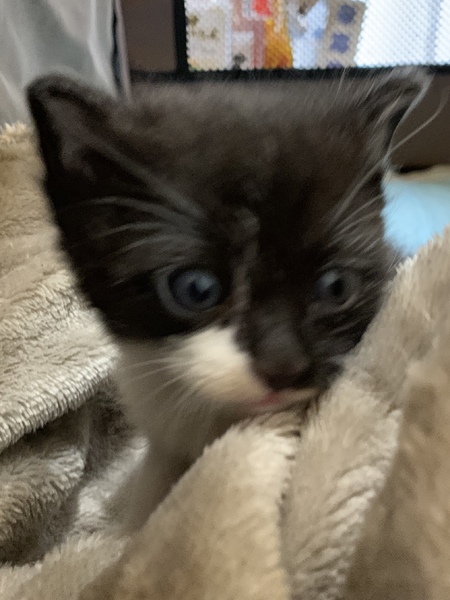 | 特徴(性格など) | 黒の多い白黒で尻尾が短めで鍵しっぽです。生後3週間ぐらいの子猫ちゃんです。まだオスかメスか不明です。 | ||