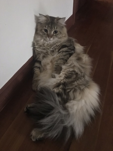 | 特徴(性格など) | とても可愛いお顔の長毛足長のイケメン君です。ふわふわの毛並みで体重は5、5㎏の大柄な子です。 性格は穏やかでおっとりしていると思います。 よくお腹をみせて寝転がっています。 |