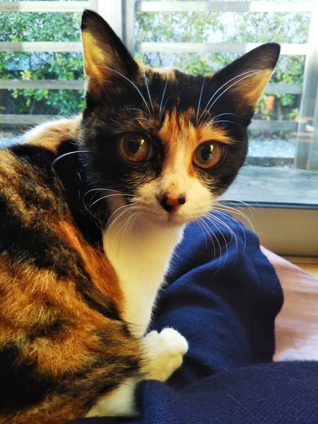 | 特徴(性格など) | 黒・オレンジ・白のコントラストがハッキリとしてキレイな三毛の女の子です。 しっぽは短め。 10/29時点では1.35kgでした。 とても甘えん坊で人にも先住猫にもヒーターにもスリスリふみふみします。首回りを撫でられるのが大好きで、病院の看護師さんにもゴロゴロ甘えていました。 保護したときはカリカリで骨が浮き出ていましたが、今は食欲旺盛でお腹がパツパツです。 トイレを失敗したことはありません。 |