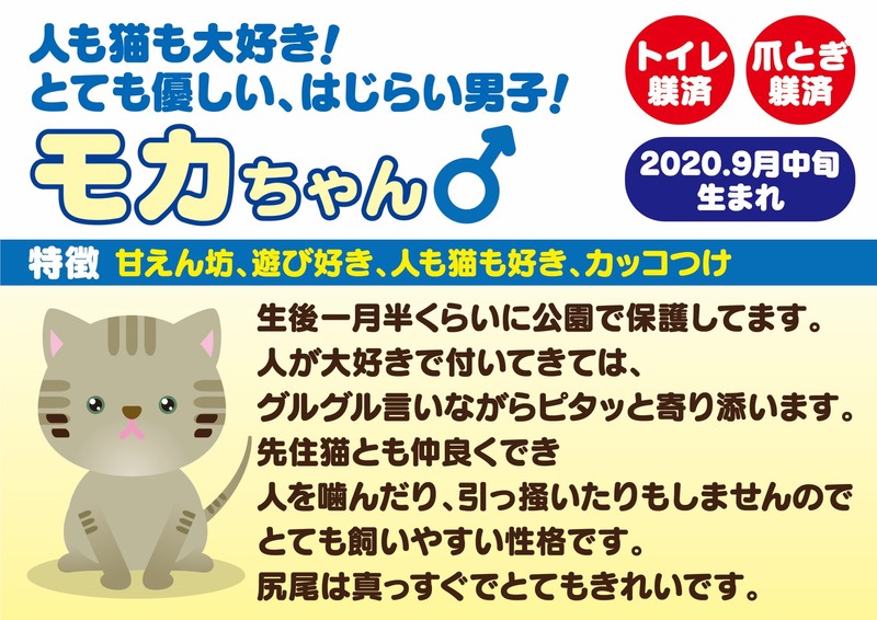 | 特徴(性格など) | よく食べ、よく遊び、元気いっぱいです♪ シャンプー、ブロードライン済み。 トイレも問題ありません。 【ウイルス検査について】 エイズ・白血病ともに陰性で問題ありませんでした。 生後3ヶ月ぐらいの、キレイなモカ色のキジトラ男子です。 公園に捨てられていたところを保護いたしました。 とにかく人も猫も大好きな子です! 真っ直ぐでキレイな尻尾をしています。 カッコつけさんなのか、爪を研ぐ時も、キャットタワーに登る時も、なんだかいつも得意気です^^ 人と一緒にいるのが大好きなので、いつでもどこでもトコトコついて回りますよ♪ 生後3ヵ月以降になると、本来なら一番やんちゃな時期で、夜中に走り回ったり、寝ている人の足をガブガブ噛むなど...同じ部屋で寝るには一苦労なことがほとんどです。 (これまでたくさんの子達を保護して来ましたが、ほとんどがそうでした。それはそれでとてもカワイイのですが笑) モカちゃんは足元に寄り添ったりしながら、朝までぐっすり寝てくれます。 この月齢で人間の生活に合わせてくれることに驚いています。 とても賢くてお利口さんです。 優しい性格をしているので、噛んだり、爪を立てることもありません。 初めて猫ちゃんを迎えられるご家庭でも安心して迎えていただけると思います^^ |