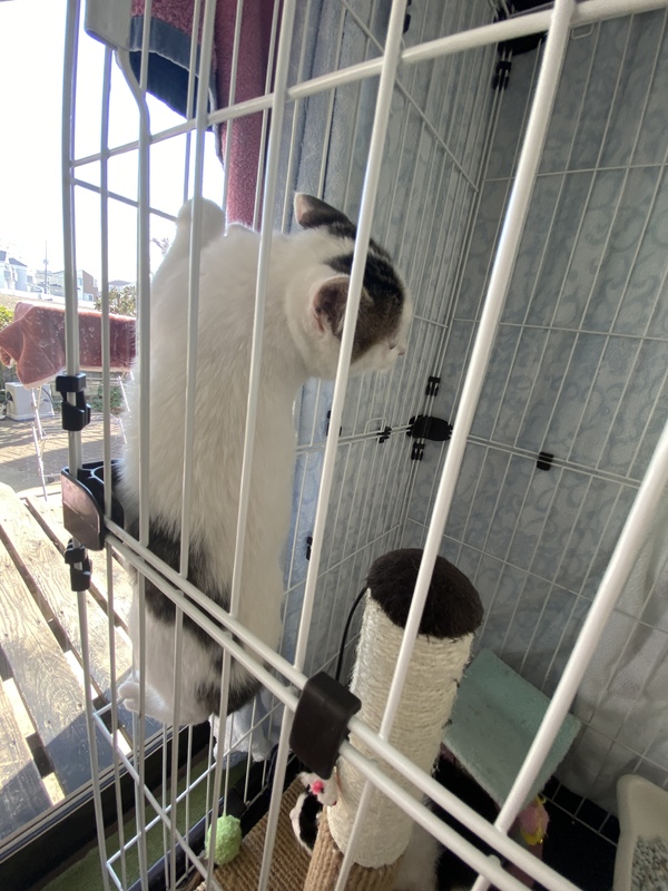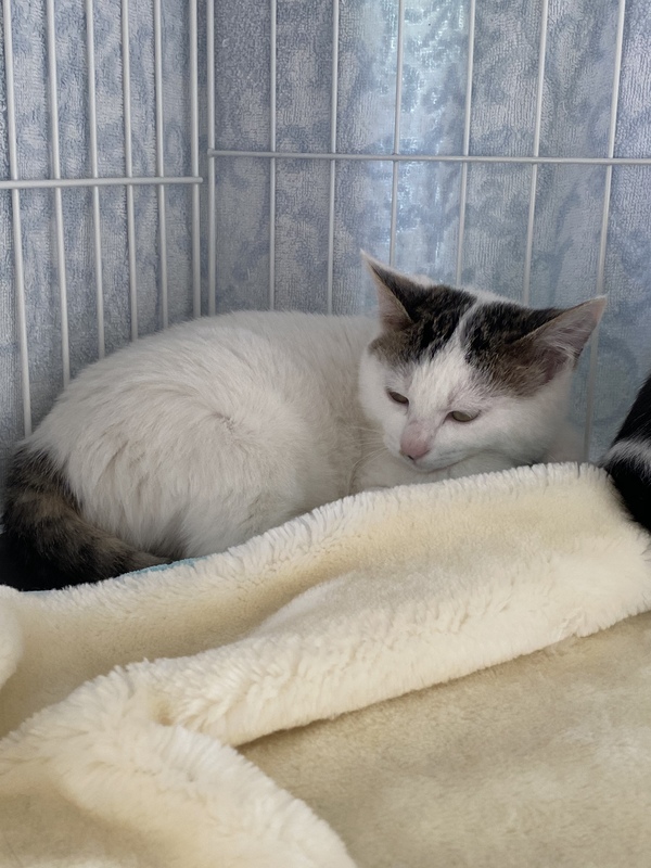 | 特徴(性格など) | 白ベースにキジ柄のハチワレとブチが腰あたりにあり、尻尾は黒のキジ柄、とてもチャーミングです。2匹姉妹でしたが、1匹里親が決まり、寂しそうにしています。今は3階建ての猫ちゃんゲージに入って人にも慣れてきました。甘えん坊です。 | ||
