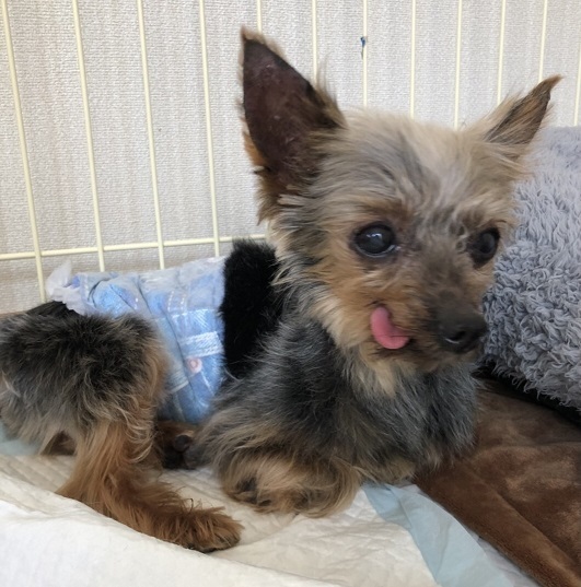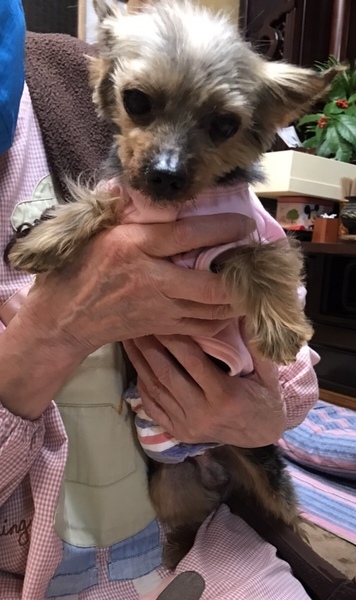 | 特徴(性格など) | ヨーキーの力丸(りきまる)君です。 推定年齢10歳以上 体重1.9キロ 瘦せすぎているため、2.2キロぐらいを目標。お腹が弱く、まだ目標には至っておりません。 小さくてかわいらしい子ですが、現在、保護時に汚れた毛を短く切ってあり、また、体重も少ないためまだ 本来のかわいさを発揮しておりません。 誰にでも人見知りなく、ようこそ~ウエルカム~な甘えん坊。 甘えるときは、身体をすりすりしてきます。抱っこはまだ苦手な様子。 りき君のルーティーンは、 ケージから出ると、チョコチョコ動き回り、ご飯をもらってしばらくすると、ゲージに戻って眠ります。いったん寝ると、爆睡してしまい、周りが多少うるさくても、ぐっすり・・・です。 いろんなことが初めて!これなぁに?とお家の中をトコトコ、探検したり、おもちゃを振り回して遊んだり…まだまだやる気いっぱいの元気なシニアヨーキーです♪ トイレは、練習中で成功率50%ぐらい。 散歩は、現在、最低限の筋力をつけるため、室内を自由に歩かせています。お散歩は、芝生など足腰に負担のない柔らかいところのみOKの段階です。 せっかく保護されて再スタートを切ったので、彼の幸せを一緒に感じながら見守ってくださる優しい里親さんを募集しています。 ★首輪は使用禁止です★ |