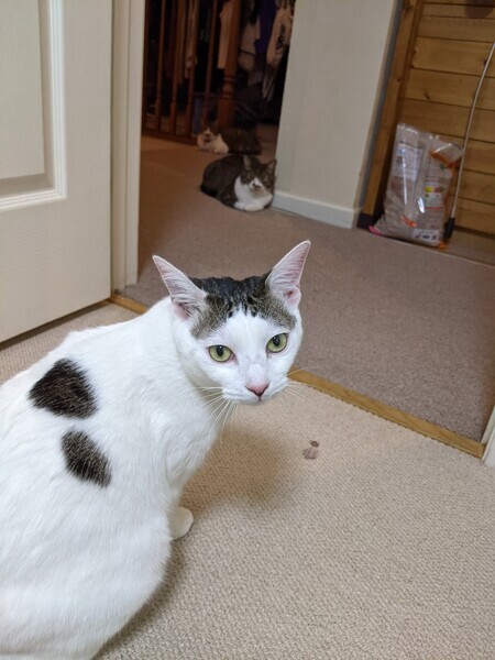 | 特徴(性格など) | 2020.6.6生まれ(推定) 毛色:キジ白 多頭飼育崩壊現場からレスキューされた、5兄妹のうちの1匹。 シフォンケーキのようなふわふわ白多めのキジ白さん。 素敵な前髪が印象的です(^▽^)/ 好奇心いっぱい、お世話係の人間にも興味津々です! 尻尾は長めのシマシマ模様、肉球はかわいらしいピンク色です。 |