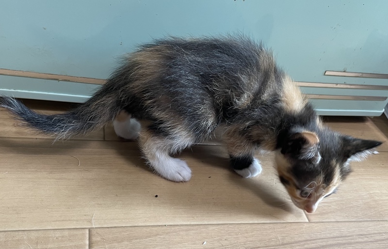 | 特徴(性格など) | サビ柄白タビで、長く真っ直ぐな尻尾です。 おとなしい女の子です。 |