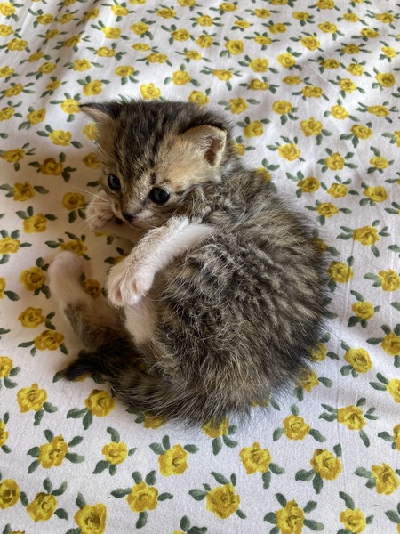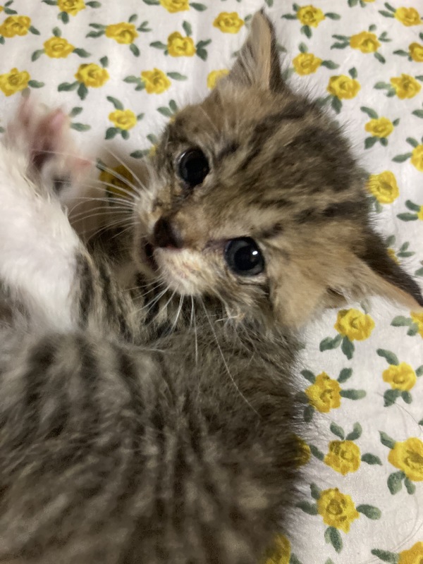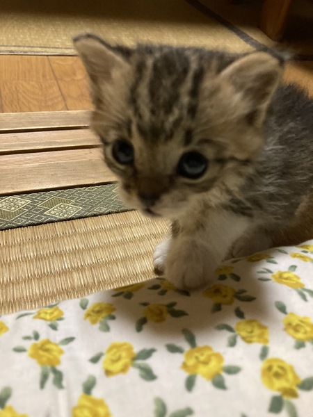 | 特徴(性格など) | キジシロの男の子。 とても元気いっぱいでよく食べ、よく遊び人の手が大好きな人懐っこい子です。ミルクも卒業し、トイレも完璧です。 |