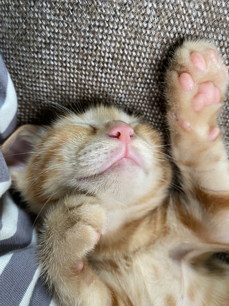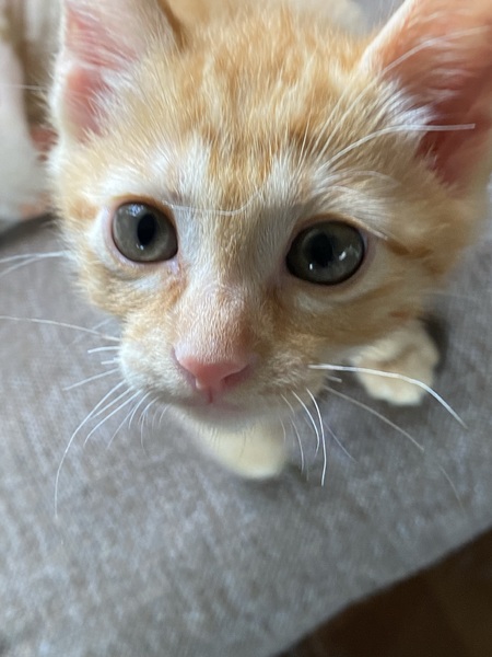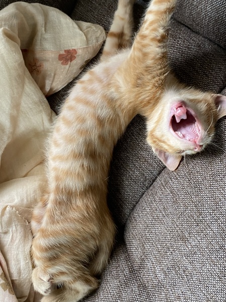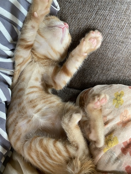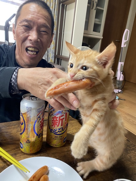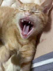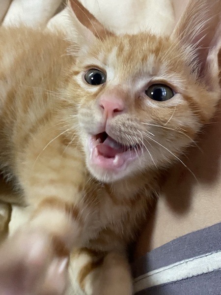 | 特徴(性格など) | 茶トラが可愛いやんちゃ盛りの男の子です。名前はポコちゃんです。犬が3匹に囲まれて育ったので、めちゃくちゃ走り回って元気です。犬と格闘します。なかなか泣きません。かぎしっぽがトレードマークです。 | ||