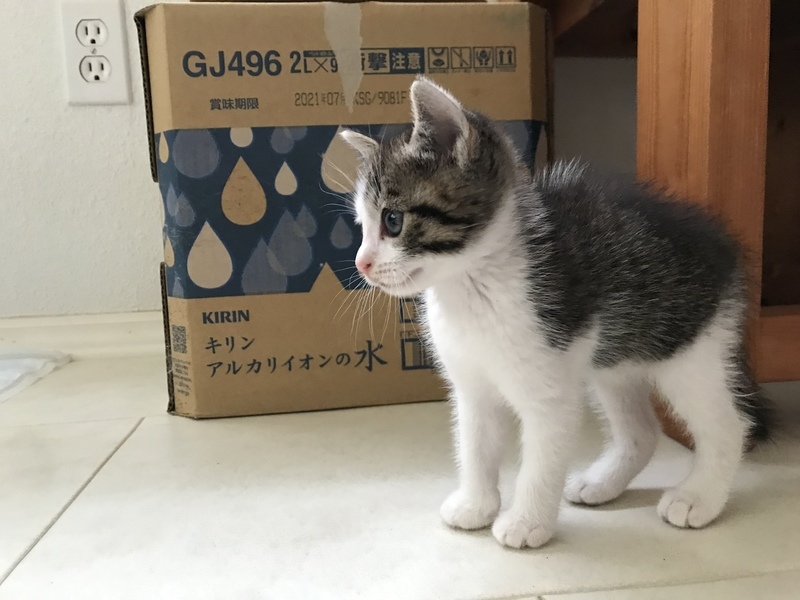 | 特徴(性格など) | 白キジです。背中のキジの中にワンポイントの白がチャームポイント。 しっぽは長くてストレート。 元気いっぱい跳ね回り、そして全身でぐるぐるスリスリしてくる甘えっこくんです。 とてもとてもかわいいこです。 保護した翌日に病院でチェックしてもらいました。 ・簡易便検査異常なし ・ノミ取り ・目ヤニが少しでていたため点眼薬処方 食欲あり、元気いっぱい。 現在、ウエットフード、ドライフード両方食べています。 トイレは猫砂トイレでちゃんとします。◎ |