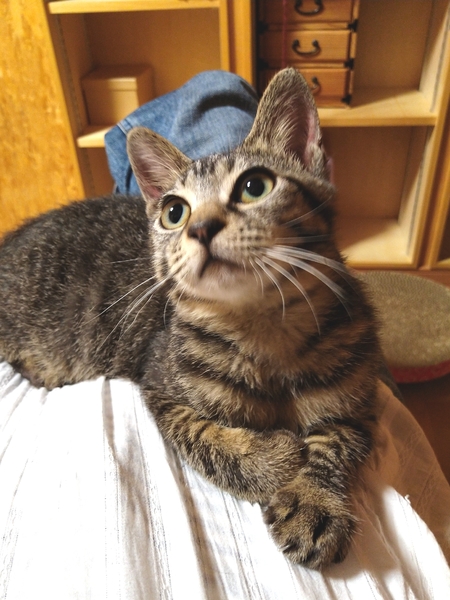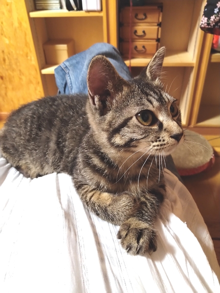| 特徴(性格など) | 【仮名】タラちゃん 【毛色】ブラウンタビー 【性別】メス 【ワクチン】済 【駆虫】済 【血液検査】子猫の為未実施 【健康状態】食意欲もあり元気です。 【性格】人が大好きな甘えっこちゃんで抱っこも好きで膝に上って来て嬉しそうに喉をゴロゴロ鳴らし、手を舐めたりとぴったり甘えてきます。首元やお腹の上に乗ってぴったりくっついて寝ようとしたり顔を寄せると愛情表現で一生懸命顔を舐めてくれる健気で可愛らしい性格です(^^)他の猫とも仲良く遊んでいて、多頭飼育にも向いている飼いやすい子です。 【兄妹】タラちゃん♀・イクラ♀・サザエ♀ 【血縁関係有り】マスオ♂・波平♂・タイ子♀・花沢さん♀ |