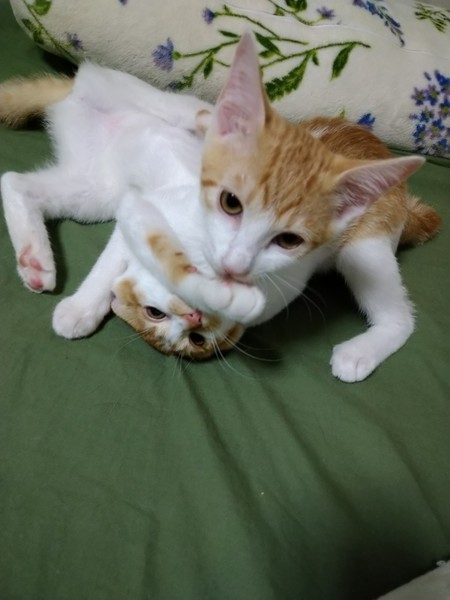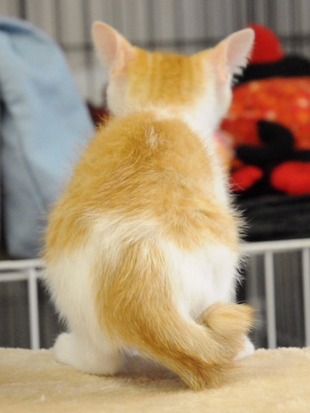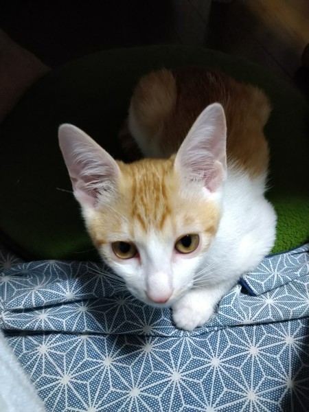 | 特徴(性格など) | 2021.3.30生まれ 毛色:茶白 カギしっぽの茶白の男の子。 好奇心旺盛で兄妹で一番はじめに行動します♪ 同居のオトナ猫にいたずらして怒られてもめげません。 少し人見知りですが、慣れると膝の上でお昼寝したりします♡ 他のネコとくっついて寝るのも好きです。 兄妹でのにゃんプロや猫じゃらしが大好きです!! |