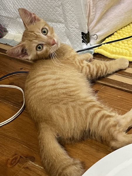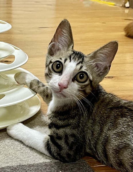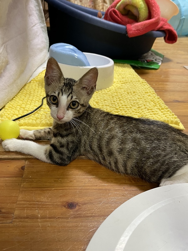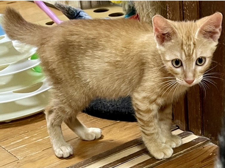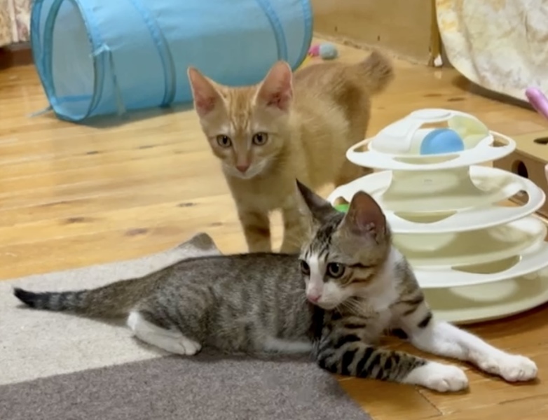 | 特徴(性格など) | 2匹とも、人懐こい男の子。茶トラのサンちゃんは、座ると膝に乗ってくる、膝乗り猫さん座ってオヤツを食べたりすると、口元までチューする勢いでよじ登ってきます。優しく下ろすと、遊びに行ってしまいますが、もっと小さな頃食べるものがなくていつもお腹が、空いていたからかもしれません? キジトラのトラちゃんは、キリッとしたイケメンさんなのですが、やっぱり甘えんぼで、お腹が空いたり、ケージから出して欲しい時など、、人の顔を見て訴えるように個性的な声で鳴きます。 どちらも遊ぶのが、大好き?走り回って、元気良く、大人の猫さんにも体当たりして、楽しむことができます。 |