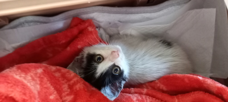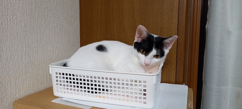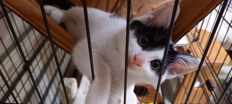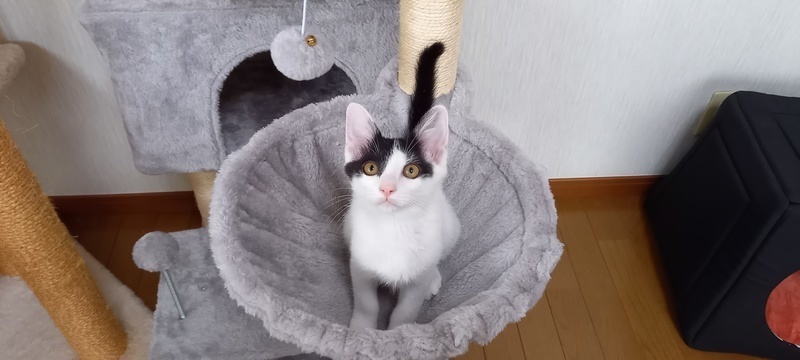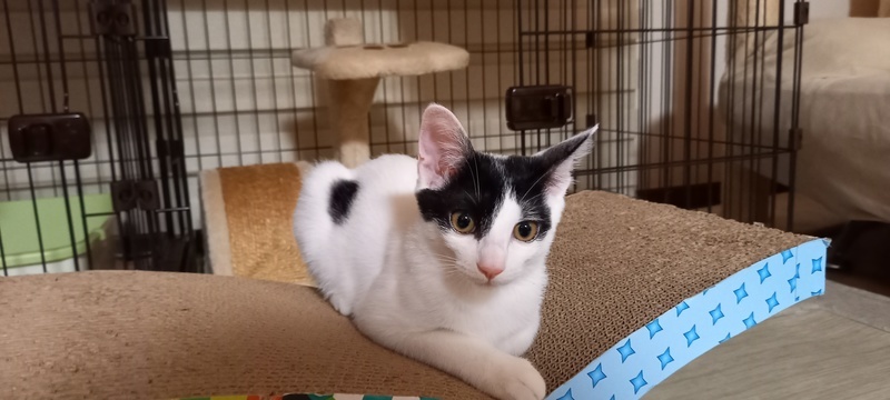 | 特徴(性格など) | 身体は白で右横に黒い丸の模様があり、尻尾は黒、頭に蝶々の様な模様があります。とても元気でお転婆ですが、人に対する警戒心は全く無く、誰にでも抱っこさせてくれて、ゴロゴロ言いながら甘えます。とても人懐っこい子です。 | ||