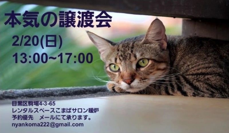 | その他(譲渡条件など) | ペットとしてではなく、生涯家族として猫を迎えて下さる方への譲渡となります。 原則ねこけん譲渡会等でのお見合いにてお申込みをお願いしております。 ◆猫さんたちとのお見合について◆ 原則「ねこけん譲渡会」でのお見合いをお願いしております。 現在ねこけん譲渡会「虎ノ門会場」および「練馬会場」での定期開催は自粛しております。 2020年11月より「島忠ホームズ」にてねこちゃん譲渡会を定期開催しています。 ※保護猫の中には性格や体質で譲渡会への参加が難しい猫さんもいます。 気になる猫さんの譲渡会参加予定の確認等も、下記連絡先へお問い合わせください。 ※譲渡会へご来場いただくのが困難な方は、個別お見合いが可能な場合がございます。 個別お見合いご希望の方は、下記連絡先まで理由を添えてご相談ください。 譲渡会には家族を待っている猫さん達がたくさん参加します♪ 募集サイトに掲載のない猫さんも参加することがあります。 家族としてお迎えいただく猫さんです。 譲渡会場で実際に会って、よ~く考えてから決めて下さい! ▼▼ねこけん定期譲渡会▼▼ 毎月第4日曜日 12:00〜16:00 島忠ホームズ仙川店 〒182-0003 東京都調布市若葉町2-1-7 https://www.shimachu.co.jp/gmshop/tokyo/313.html ※当日11:30より整理券を配布。(各回15分、各回先着3組様) 譲渡会等イベント開催日程・詳細は、イベント一覧よりご確認ください。 ▼▼イベント一覧▼▼ https://satoya-boshu.net/event/?@button_name@=search&Event_MemberID=1288 ※事前のご予約などは必要ございませんので、ご家族皆様でぜひお越し下さい。 ※当日の体調などにより譲渡会を欠席することがあります。 当日のお問い合わせにはお答え出来かねますので、ご理解いただけますようお願い申し上げます。 ▽▽こまばサロン暖炉「本気の譲渡会」▽▽ 保護猫譲渡会カフェ こまばサロン暖炉様が主催されている譲渡会に ねこけんの保護猫が参加させていただいていることがあります。 https://www.facebook.com/nyankomaba/events 譲渡会日程や詳細につきましては、主催者様のFBページをご確認ください。 ※ねこけん保護猫さんの譲渡会参加予定の確認は、ねこけんへお問い合わせください。 *** ◆必ずお守り頂く事◆ ①終生飼養 ②完全室内飼養 ③年1回のご報告 ④ペット飼育可能な物件にお住まいであること ただし、以下の該当の方は、譲渡出来ない場合がございます。 ※学生、安定的な収入のない方 ※60歳以上の方は、成猫さんを家族に迎え入れることが出来ます。 里親様のご年齢に応じた成猫の譲渡となりますのでご相談ください。 ◆譲渡費用について◆ 不妊去勢手術・医療費の一部負担をお願いしております。 お届けエリアによっては往復高速料金(実費)を別途ご負担いただく場合がございます。 なお、交通費に関しましては正式譲渡に至らない場合であってもご返却できませんので予めご了承下さい。 ・ご希望の猫さんと家族になるまでの流れ ・譲渡時にかかる一部ご負担金などの詳細 ・譲渡契約書のサンプル等 下記URLに掲載しておりますのでご確認ください。 https://nekoken.jp/jotokai/joto-nagare/ https://nekoken.jp/jotokai/joutokibou/ ◆引き渡し方法◆ 必ずご自宅まで猫さんをお届けさせていただきます。 1週間程度のトライアル後、正式譲渡となります。 ◆お届け可能エリアについて◆ 応募可能県内であっても、遠方の場合アフターフォローの関係上お断りさせていただくことがございます。 ご心配な際は、前もって市区町村名や最寄り駅等をメールにてお問い合わせいただけますと幸いです。 お手数をおかけいたしますが、何卒ご了承くださいますようお願いいします。 *** ▼▼連絡先▼▼ ご質問等ございましたらお気軽にお問い合わせください。 NPO法人ねこけん東京本部 https://nekoken.jp/inquiry/ nekoken@cat.email.ne.jp 担当:溝上 [ホームページ] https://nekoken.jp [Instagram] https://www.instagram.com/nekoken2222/ [ブログ・ボラ日記・YouTubeなど] https://linktr.ee/nekoken フォロー・チャンネル登録よろしくお願いします! |