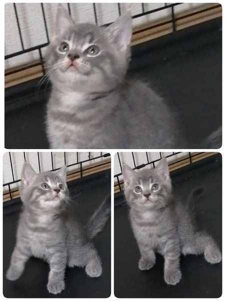 | 特徴(性格など) | 性格はまだ子猫なので遊び好きでワンパクです。 見た感じ慣れない人には臆病で人見知りさんです。 立ち耳くん、瞳は猫目、輪郭はまんまる、ブルーの柔らかい被毛(ダブルコート)です。 少しだけ縞模様が入っていますが、大人になると消えるのかこのまま残るのかわかりません。 被毛が密集タイプのため、成猫になる頃にはブラッシングが必要だと思われますので、子猫のうちから慣らしてあげてください。 模様にこだわりが有る方、血統や兄弟関係などブリーダーへの謝礼含め伝言や連絡先の開示はお断りします。 里親募集の性質をご理解の上、ご応募ください。 |