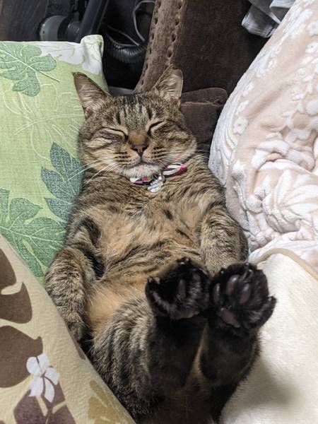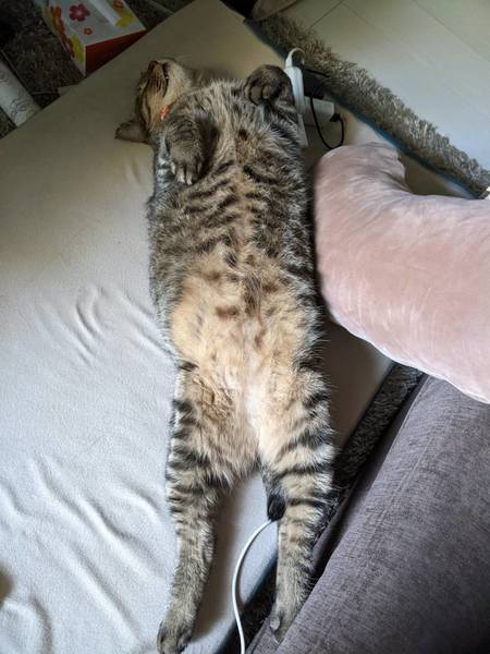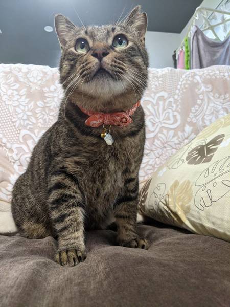 | 特徴(性格など) | 桜カットのキジトラ(元野良猫) とても温厚で順応性の高い甘えん坊。 カリシウイスルキャリア(獣医師診断) 歯石はありませんが、 やや歯肉で、口臭があります。 ほか、健康状態に問題なし よく食べる子で肥満ぎみ (体重6.8kg前後 ) |