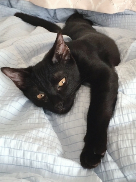| 特徴(性格など) | 2021.5.17生まれ(推定) 毛色:黒 全身真っ黒、シッポも長く、触り心地満点です。 肉球もコーヒー豆のように黒いですが、爪は透明なので爪切りは楽です。 兄妹猫のさつきと仲良く追いかけっこしたり、おもちゃで遊んだりします。 ちょっぴりビビりさんですが、 抱っこすると大人しくそのまま寝たりします♡ 先住猫さんがいても、慣れてくると寄り添っていく優しいタイプの女の子です。 |