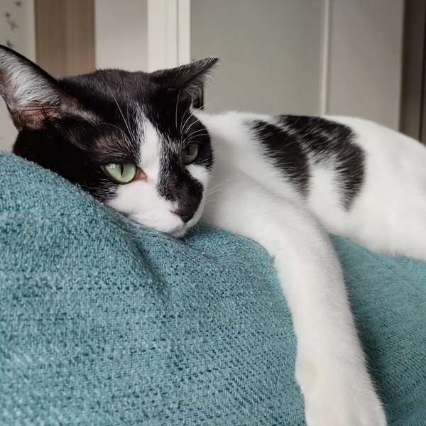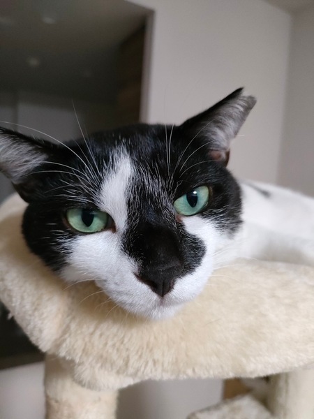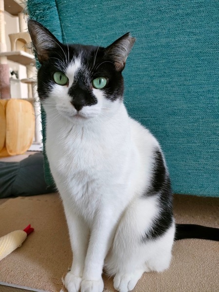 | 特徴(性格など) | 2020.6.1(推定) 毛色:白黒 黒くて長い尻尾、黒いお鼻、緑の瞳の小顔美人な女の子。 尻尾立てながら、スリスリ寄ってきて鼻チューします。 かと思ったら、遠ざかったり足蹴りするツンデレ女子︎♡ ツンデレ好きにはたまらない、ものくろちゃんです♪ 同じく里親募集中のぶんたとも、とても仲良しです。 |