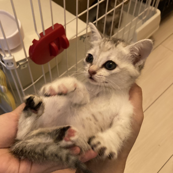 | 特徴(性格など) | 人慣れ ★★★★☆ 食欲 ★★★★★ やんちゃ ★★★☆☆ 運動神経 ★★★★☆ 人慣れしており、遊ぶのが大好きな活発な子です。 兄妹猫に飛びかかったりもしていますが、1匹で走り回ったり置いてある猫じゃらしに飛びかかったりと、1人遊びも上手です。 運動能力も高めなので、いろんなところ登ったり、隙間に入っていったりするタイプです。 とにかく動きたい!遊びたい!という性格なので、抱っこはあまり好きじゃなさそうです。(避妊手術したら変わるかもしれません) トイレトレーニング済なのですが、砂をかけるのは少し下手です。 【柄】 サバ白 【性別】メス 【体重】700g 【エイズ白血病検査】陰性 【ワクチン】3種混合ワクチン1回目済 【現在の治療経過】猫風邪・虫下し・目ヤニ治療中 ※2021.10.8時点 |