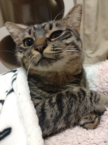 | 特徴(性格など) | 2021.4.2生まれ(推定) 毛色:キジトラ 木の葉色のウルウルな瞳がかわいい女の子。 濃いめのキジトラ模様で、その被毛はトゥルットゥルの艶々キューティクル!! ちょっぴりビビリさんなので、クリクリのおめめでいつも様子を伺っています。 怖がりさんだけど、慣れてくると控えめに喉をゴロゴロ鳴らして甘えてくれます♡ 抱っこも爪切りもじーっとしてくれる良い子ちゃん。 オモチャは大好き♪ 遊ぶ時は元気いっぱいな姿を見せてくれます。 まわりの子とは時間をかけて仲良くなるタイプです☆ 新しい環境に慣れるまでは少し時間がかかるかもしれませんが、 ゆっくり このは のペースに合わせて下さるような里親様と出会えたら嬉しいです!! |