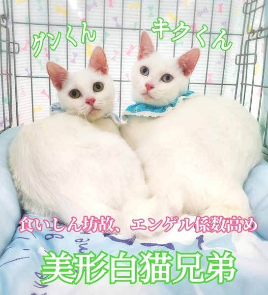 | 特徴(性格など) | 11月28日(日)12:00~16:00(最終申込15:30) ねこざんまい譲渡会【東日本橋会場】に参加予定です! 会場の案内はこちら♪ https://ameblo.jp/neko3mai/entry-12711651680.html 11:30より、2階会場入口にて受付を開始します。 受付時に入場予定時間が記入された整理券をお配り致しますので、整理券を受け取った方はお時間になりましたら2階会場入口に番号順にお並び下さい。 ※11:30より早くいらしてもお待ちいただく場所がございません。 また、近隣にお住まいの方や他階フロアのご利用者様にご迷惑となる場合がございますので、受付開始時間にあわせてお越しくださいますよう、何卒ご協力お願いいたします ※ねこざんまい譲渡会は、先着順で里親様を決定する譲渡会ではありません。 先に申し込みをした方を優先することもありません。 お話をして、その猫ちゃんに合ったおうちに決めさせていただいております。 12時に開場し、里親様の決定は14時以降となります。 14時以降にご入場の場合、希望の猫ちゃんが決定している可能性があります。 また1頭に対し多数のご希望をいただいた場合、早めに申し込みを締め切らせていただく場合がございますので、予めご了承下さい。 ※里親様決定は14時以降となります。 その後、お迎え準備の説明等のお時間を頂戴しますので、お時間に余裕を持ってご来場下さい。 ※猫ちゃんとのお見合いは譲渡会となります。 譲渡会ご来場につきまして、事前予約は不要です。 どうぞご家族みなさまでご来場下さい♪ ★★★ご来場前に必ずご確認下さい★★★ 《里親様へお願いはこちら》 http://www.neko3mai.com/condition/condition.html 《家族募集中猫ちゃん一覧はこちら》 http://www.neko3mai.com/entrycats/entrycats.html ◆ 名 前 ◆ グンくん ◆ 年 齢 ◆ 6ヶ月半 ◆ 性 別 ◆ 男の子 ◆性格は?◆ 丸顔が可愛い白猫の男の子、グンちゃん♪ 可愛い顔してますが、声は超ダミ声(笑) このギャップがたくさんあるグンちゃんの魅力のひとつ。 とっても人馴れしており、初めての人にも甘える甘える♡ 抱っこナデナデ大好きです! そして、ごはんを大好きです!!! 食べっぷりは気持ち良いほど。 兄弟のキクちゃんと比べると身体は小さいですが、とっても元気です。 他の猫ちゃんと遊ぶのが大好きなので、仲良し兄弟のキクちゃんと一緒にお迎えいただけると嬉しいです。 家庭内の事故や誤飲防止のため、きちんと整理整頓された清潔な空間での生活を希望します。 ペットではなく、共に暮す家族の一員としてお迎えくださるお家を希望しておりますので、お世話してくださるご家族の皆さん、またはご夫婦ご一緒に会いにいらしてくださいね! 先住犬猫や小さなお子様がいらっしゃるご家庭への譲渡は、ご希望に添えない場合がございます。 脱走や危険防止対策をしていただけないご家庭への譲渡は、大変申し訳ございませんがご遠慮させていただいております。 |