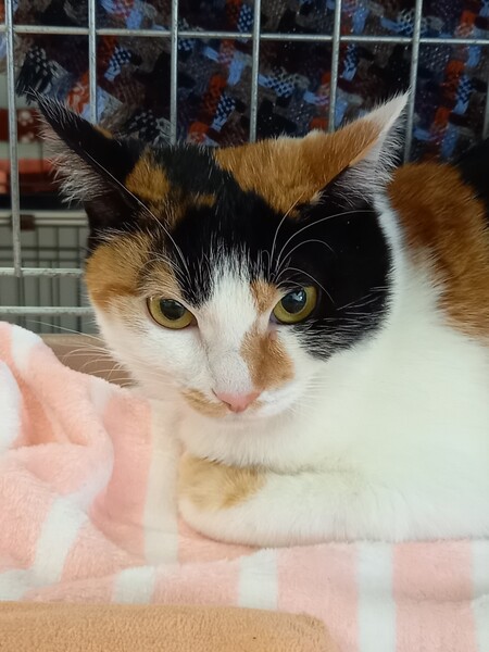 | 特徴(性格など) | 2021.4.6生まれ(推定) 毛色:三毛 可愛らしい声で鳴く小柄な三毛猫さんです。 撫でなでが大好き。 お腹も触らせてくれます。 抱っこは練習中。 運動神経抜群でとても活発な子です。 兄妹猫の めだる を毛づくろいする優しい子です。 |