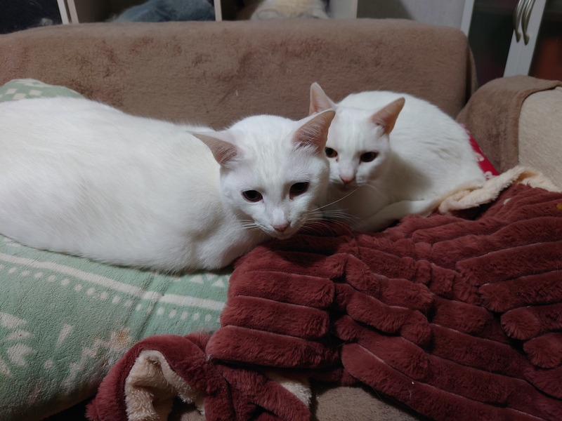 | 特徴(性格など) | 白猫のぽっちゃりとガリガリの兄弟です。 甘えん坊で一緒に寝てくれますよ 健康状態問題なしです。 |