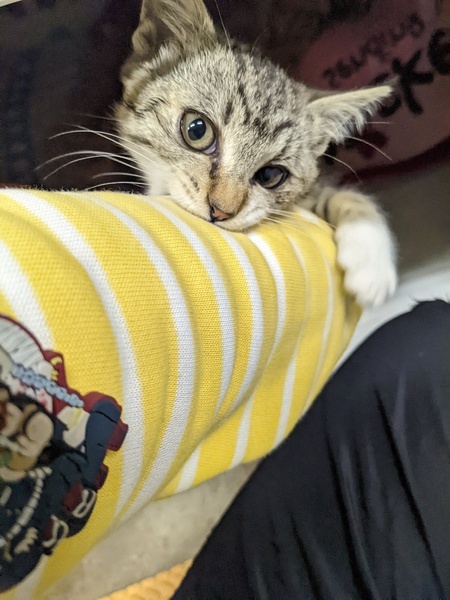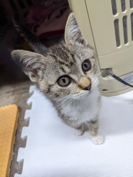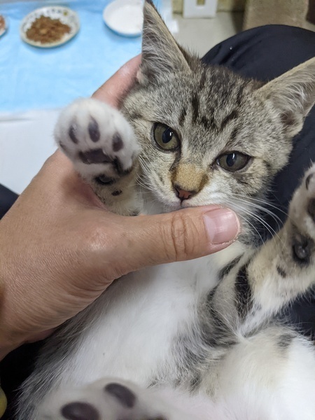 | 特徴(性格など) | シロちゃんです! キジ白 少し茶色っぽく薄めのキジ色です! 手足とお腹が白く靴下と手袋を履いているみたいでとても可愛いです(^^) 仔猫らしくお転婆さんで元気いっぱいです! ただ遊んでいる時など絶対に爪をだしたり、噛むときなど痛くなく優しいです! なんでもよく食べます(^o^) ウンチも下痢等1回もなく健康です! 人懐こいです❤ 現在1、5キロちょっとくらいです。 エイズ白血病検査陰性でした!! |