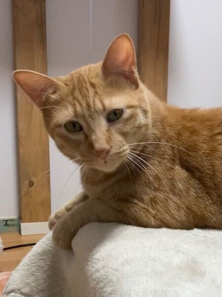 | 特徴(性格など) | ホントはお茶目で陽気な「わたげ」くん❤ まだまだビビりで自分からスリスリ甘えたり抱っこもできないけど、玩具大好き♪ 大好きパウチ・タイムになると、みんなと並んでしっかり食べてくれるようになりました♪ 現在、ドライフードを置き餌として栄養補給、水分補給のため一日2回パウチを与えています。 <推定誕生日:2021/8月始め> |