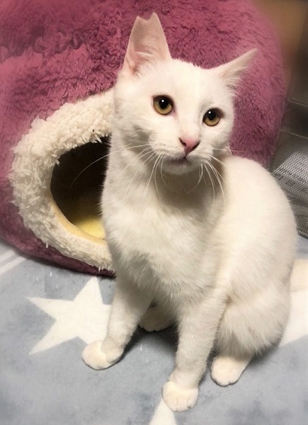 | 特徴(性格など) | 真っ白・鼻肉球ピンクの男の子 環境に慣れるまで少し時間が必要です。 移動して直ぐは怖がりののんきさん、現在は元気のんき者です。 撫でるとくるくる反転しバンザイをします。 ご飯の気配を察知すると、じーっとお皿の前からこちらを見続けていたりします。 |