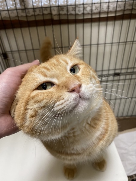 | 特徴(性格など) | 「俺、つしま」みたいなデカ顔が魅力的な茶トラの男の子です。仮名を翔平とつけました。身体は大きいですが、優しい性格でおっとりしています。動画のようにこんな大きなお顔をグリグリ撫でることが出来るのは、至福のひと時でしょう。南国育ちで大らかな性格の翔平くんと一緒に暮らしてみませんか? | ||