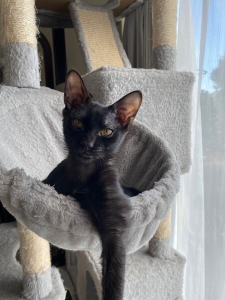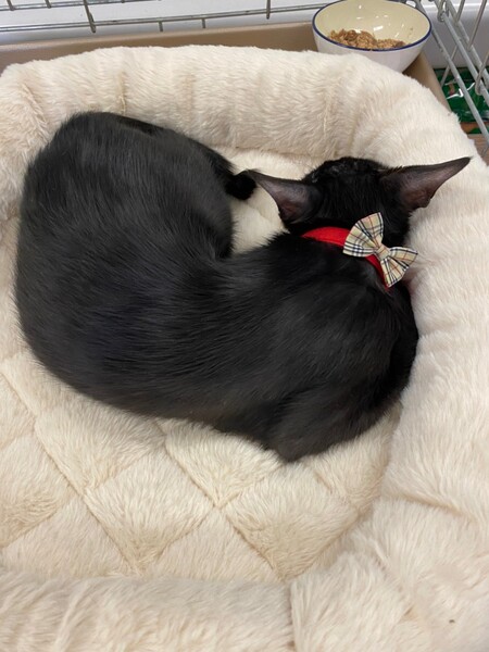 | 特徴(性格など) | 2021.9.10生まれ(推定) 毛色:黒 神社で兄弟で保護され、ミルクで育ちました。 小柄ですが運動神経抜群でピョーンとジャンプして 人の肩に乗りうまくバランスを取ります。 暫くすると肩で甘えだし、人の顔や頭を グルーミングをします。 お膝も大好き、活発ですがとても甘えん坊の黒猫です。 猫慣れもしています。 おもちゃのじゃらしやボール遊びも大好きです。 |