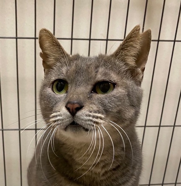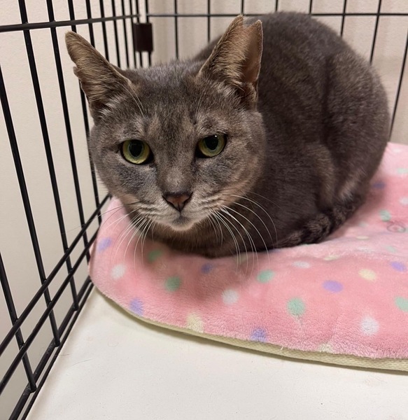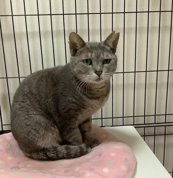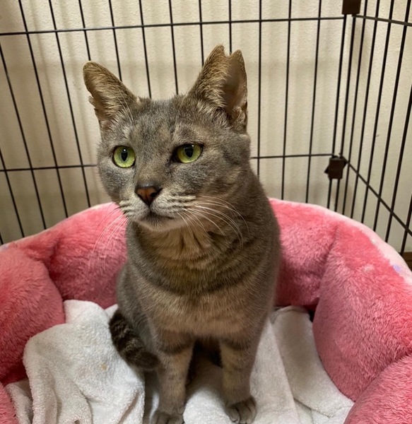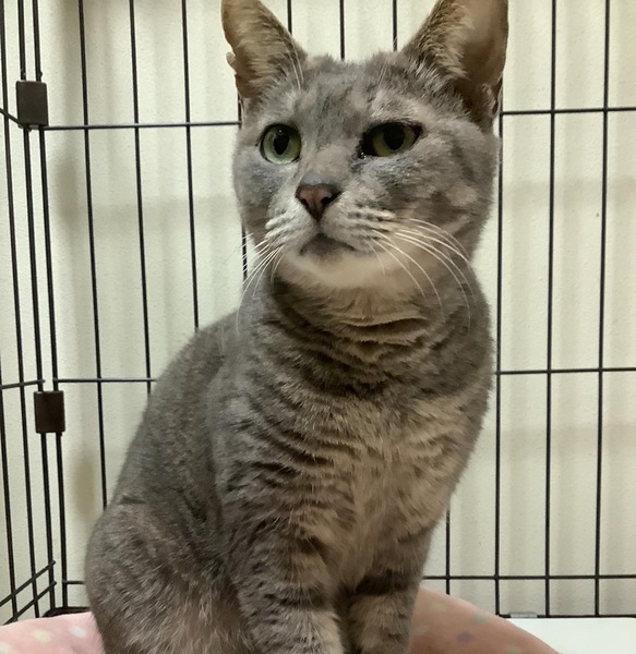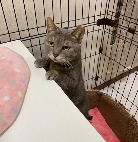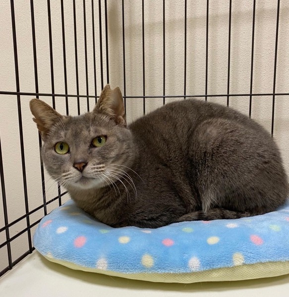 | 特徴(性格など) | 珍しいグレーの毛並みが美しい美波ちゃんは、猫らしいツンデレな性格です。最初はちょっと怖がりさんでしたが、食べるのが大好きなので、人の顔を見るとニャーニャー鳴いてご飯をおねだりしていますし、ご飯を食べている間に体を撫でられるようになってきました。ケージにスリスリ身体を擦り付けて甘える仕草も見せてくれるので、馴れるのも時間の問題だと思います。妖艶なこの眼差しで見つめられたら、ご飯でもちゅーるでもついあげたくなってしまいますね(笑)。 | ||